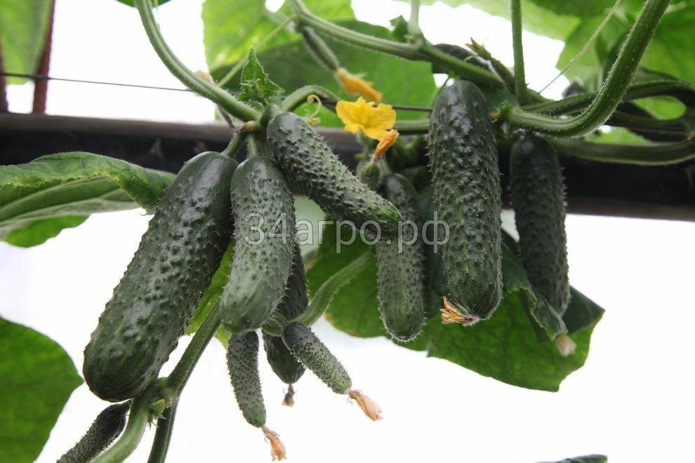 Плоды однородные, крупнобугорчатые, насыщенно-зеленого цвета. В одной пазухе формируется 2-4 плодов длиной 10 -12 см;