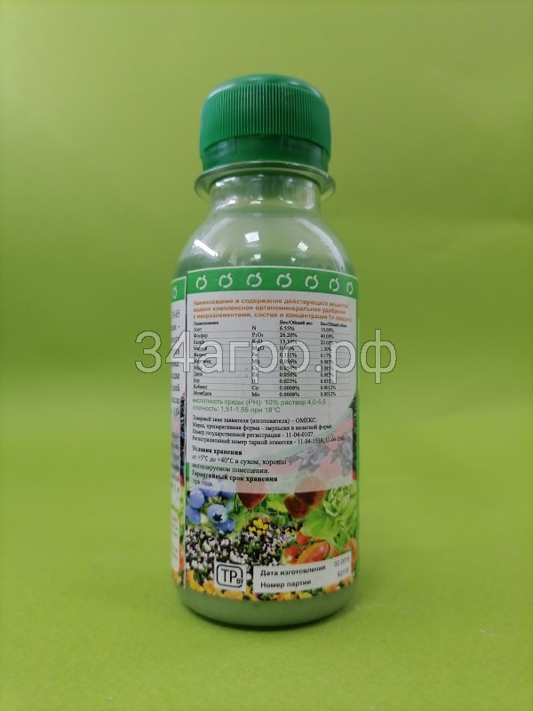 Состав (г/л): водорастворимая эмульсия, содержащая NРК, магний и хелатированный набор микроэлементов: 100 N+400 P + 200К + 15 Mg + 1,75 Fe + 0,85 Mn + 0,88 Zn + 0,85 Cu + 0,35 B + 0,012 Mo + 0, 012 Со