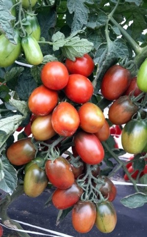 Главная особенность сорта в его необычном коричнево-фиолетовом окрасе с темным пятном у плодоножки, а также сладком вкусе и аромате, которые нетривиально сочетаются с рассолами и маринадами. Кусты высотой до 120 см, требуют пасынкования, подвязки к крепким опорам, так как на каждой кисти вызревает до 7-10 плодов. Хотя они и имеют небольшой вес, 30-50 грамм, однако их количество способно поломать ветви. Сорт среднеспелый, вегетационный период 103-105 дней. Урожайность с квадратного метра – 5 – 5.5 кг. Помидоры не трескаются при консервации, благодаря плотной кожуре, однако длительную транспортировку выдерживают плохо.